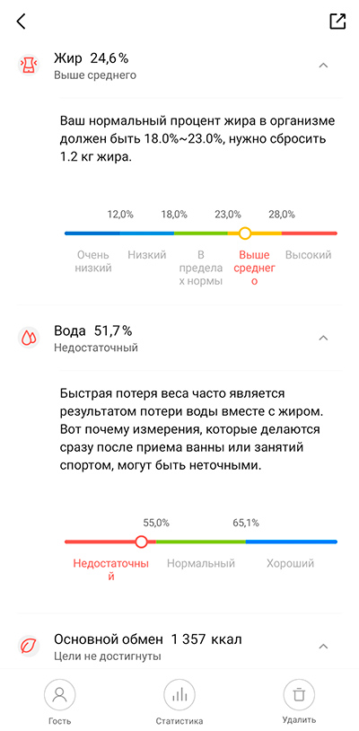 В общем, мне не сильно понравилось, как работают эти весы. Измерения они делают и результаты хранят, но только для одного человека, также приложение не выводит никакой поясняющей информации к результатам измерений.