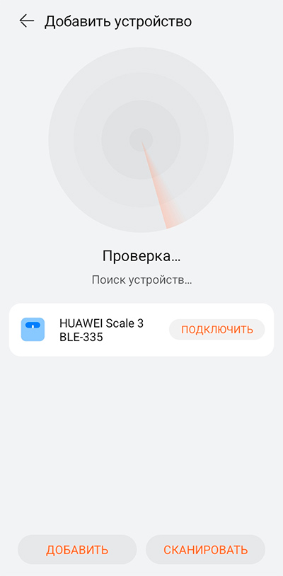 Приложение, с которым взаимодействуют весы - Huawei Health. При запуске этого приложения нужно зайти в раздел "Устройства", там выбрать "Добавить устройство": приложение обнаружит весы и предложит их подключить.