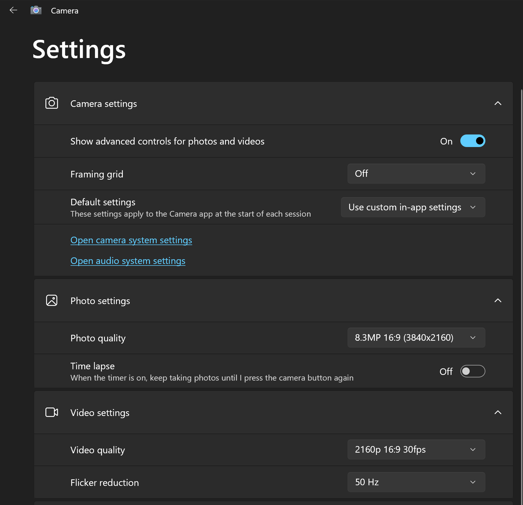 Основные настройки: разрешение (вплоть до 2К), угол захвата, подавление мерцания.