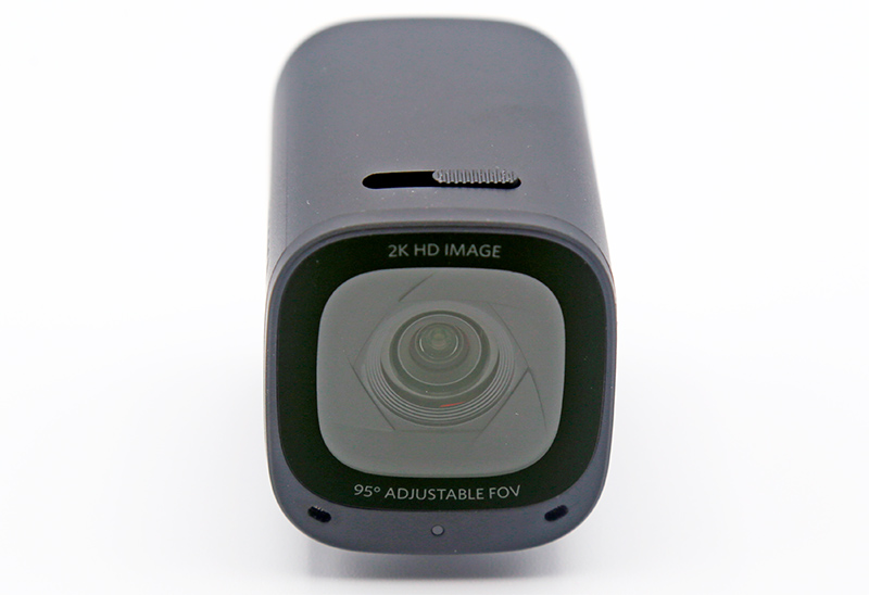Лицевая часть камеры. Объектив, защитная шторка, два микрофона, светодиод, показывающий режим камеры: выключена, включена.