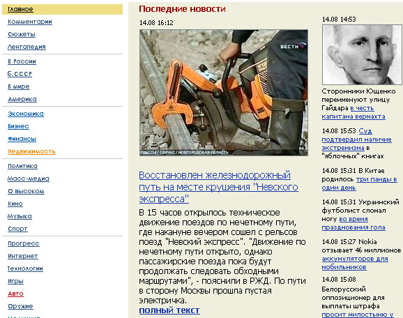 Ну и, конечно, следует отметить явное удобство просмотра сайтов в режиме VGA - при таком разрешении уже можно не выискивать PDA-версии сайтов, а использовать обычные страницы. Вот, для примера, обрезанная картинка сайта Lenta.ru в высоком альбомном разрешении на экране X500+:
