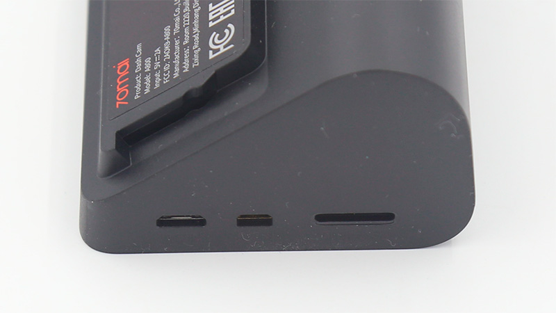На правой грани - порт microUSB, к которому подводится питание, порт для подключения задней камеры, слот для карты памяти microSD. Карта в слот вставляется глубоко, из слота не торчит, вставить и снять ее без применения какого-то инструмента практически невозможно. Почему так сделано (а так делается во многих видеорегистраторах) - мне непонятно совершенно. Если бы карта торчала из слота миллиметра на два, ее спокойно можно было бы вставлять и извлекать рукой. А так - черта с два. И это плохо, потому что скачивать нужные ролики через приложение очень неудобно, потому что они скачиваются очень и очень медленно.