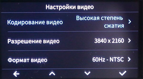 Кодирование видео - высокая степень сжатия (доступно 4К), низкая степень (доступно только FullHD).