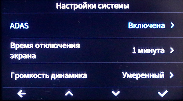 Включение-выключение системы ADAS (предупреждение об уходе с полосы, об опасном сближении), настройка времени выключения дисплея и громкости динамика.