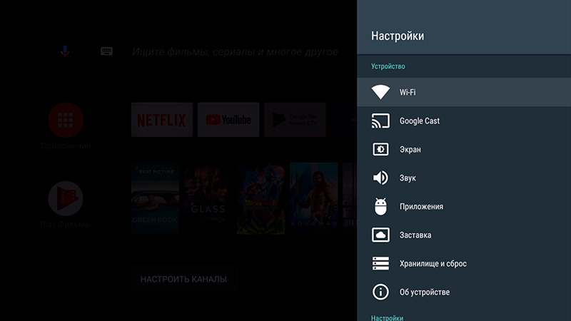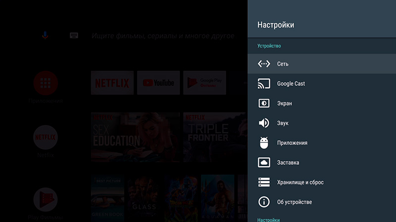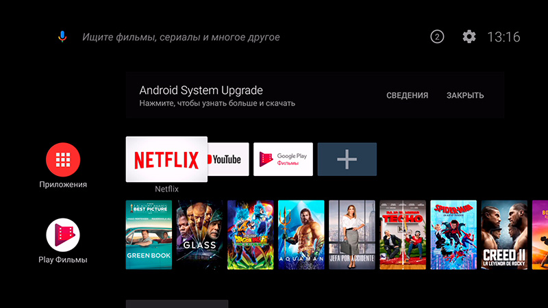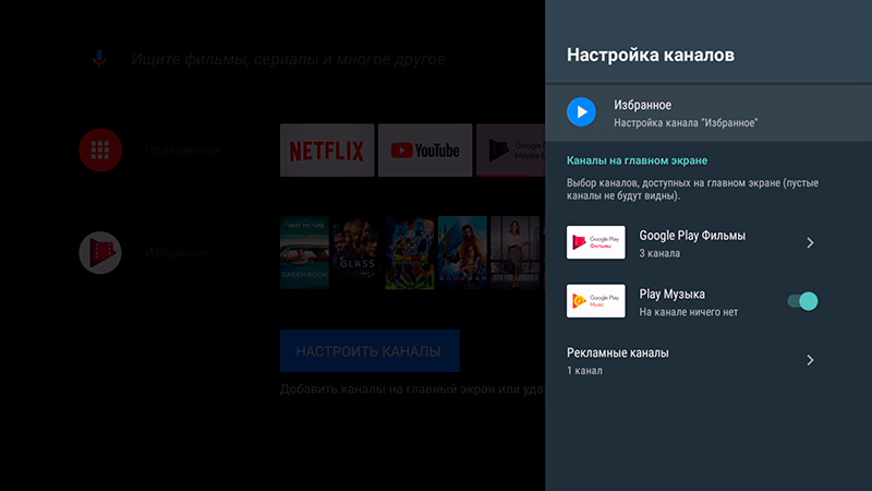 На главном десктопе: голосовой поиск, настройки, приложения (по умолчанию на десктопе Android TV выводятся только те приложения, которые оптимизированы для Android TV), стриминговые сервисы, "Play Фильмы", Youtube. Внешний вид главного экрана и приложений на нем вы можете настраивать.