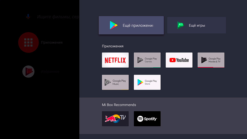 Кнопка "Приложения". Верхняя пиктограмма "Еще приложения" выводит оптимизированные под Android TV программы. Из Google Play вы можете загружать любые андроидные приложения, совместимые с Android TV. (Несовместимые тоже можно установить, но вручную - через инсталляцию APK.) Любое установленное приложение можно добавить в избранное и поставить на то место на десктопе, которое вам нужно.