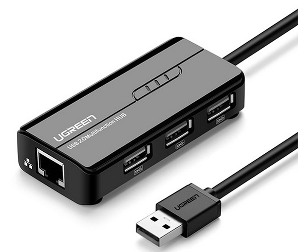 Проблема, конечно, решается покупкой вот такого переходника, который одновременно еще и USB-хаб, что актуально для данного устройства, у которого всего один порт USB.