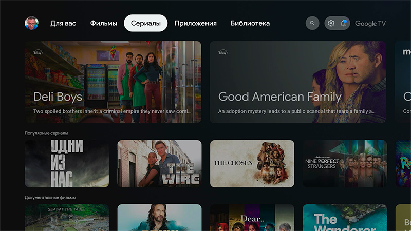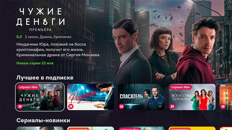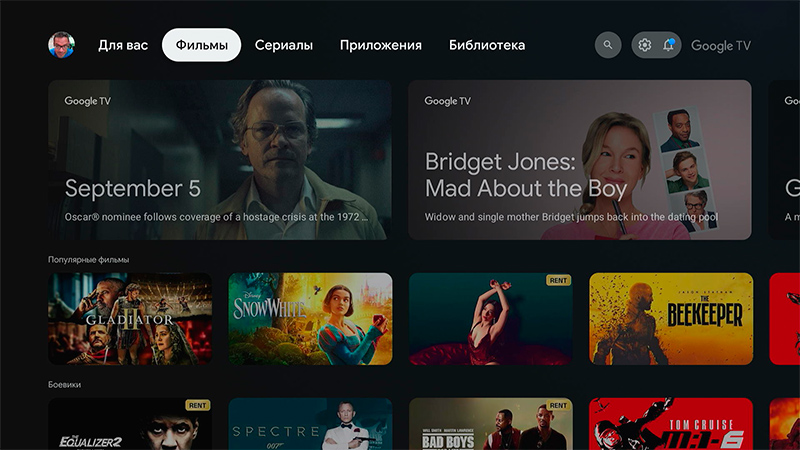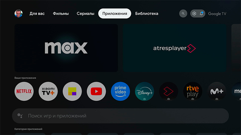 Главная страница медиаплеера. Основной раздел система будет подстраивать под ваши предпочтения. Меню сверху - подборка для вас, фильмы, сериалы, приложения, библиотека купленных фильмов и сериалов.