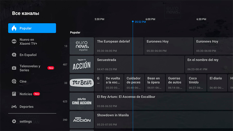 С пульта отдельной кнопкой вызывается Xiaomi TV+: там транслируются сотни телеканалов с расписаниями, также есть самые разные фильмы и сериалы, спортивные каналы и так далее.