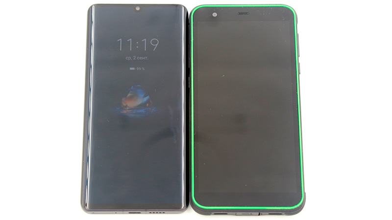 Вот этот смартфон рядом с Huawei P30 Pro. Понятно, что флагман прошлого года от Huawei выглядит заметно более изящным, но и BlackView BV6300 Pro рядом с ним не выглядит совсем уж деревенским увальнем (вот приготовленный на обзор Oukitel WP5 Pro таковым выглядит, да).