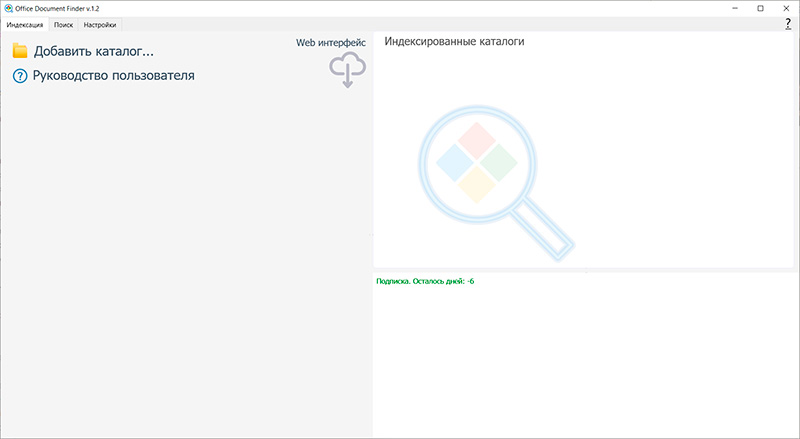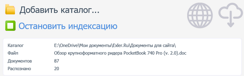 Если вы добавили в папку какие-то новые документы и вам нужно, чтобы они сразу попали в поиск, то нужно просто нажать кнопку "Начать индексацию": информация о процессе индексирования будет выводиться в приложении.