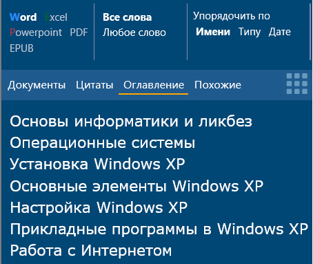 Если рассматриваемый документ имеет оглавление, то его верхний уровень будет показан в разделе "Оглавление".