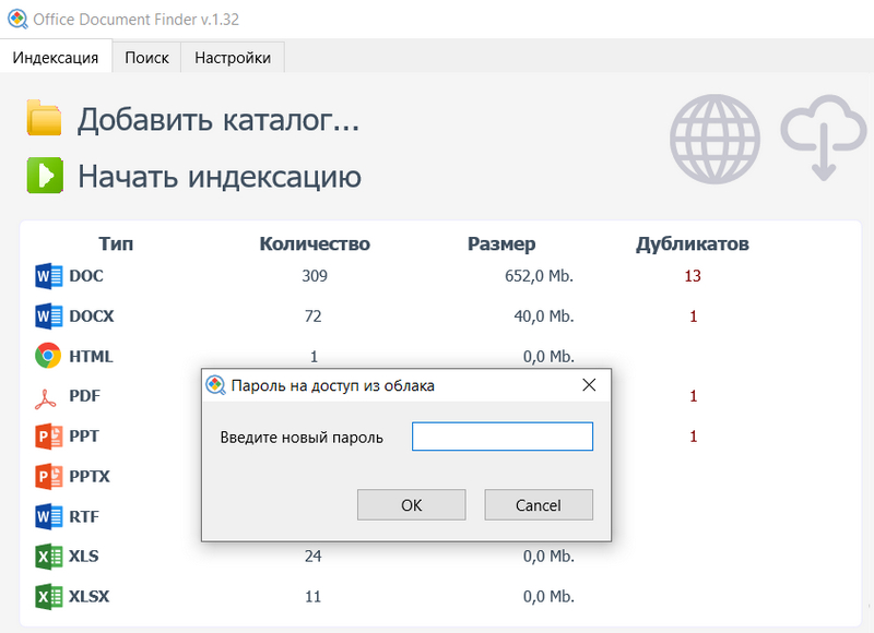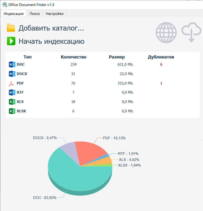После обработки программа покажет вам соответствующую статистику: сколько каких документов проиндексировано, какой размер тех или иных групп документов. Обратите внимание на то, что программа также показывает обнаруженные дубликаты (полностью идентичные файлы), они в индексацию не включаются.