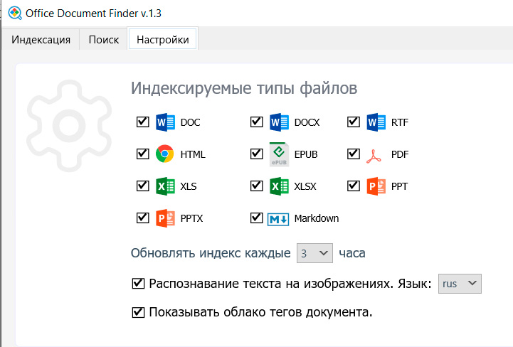 В меню сверху есть раздел "Настройки", там можно выбрать, какие именно виды документов нужно индексировать. Также там задаются частота обновления индекса, возможность распознавания текста на изображениях (например, в PDF-файлах) и показ облака тегов документа. (Внимание: распознавание текста на изображениях очень сильно замедляет скорость индексации!)