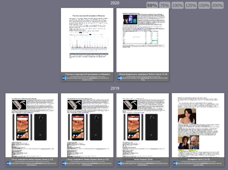 Ну и еще важный момент. Выдачу документов можно сортировать по имени, типу и по дате. При сортировке по дате и в столбце отбора документов их будут группировать по годам и при просмотре миниатюр.