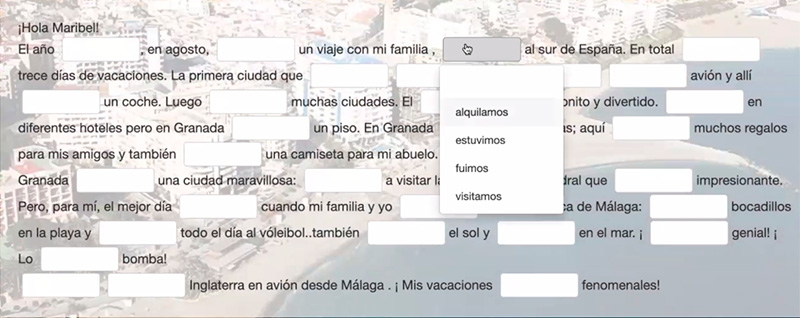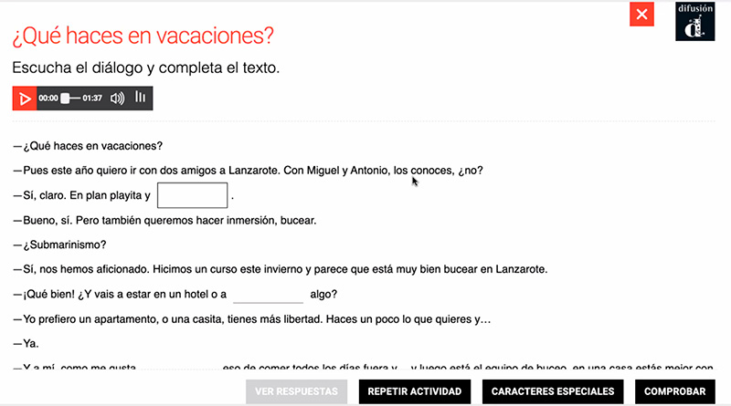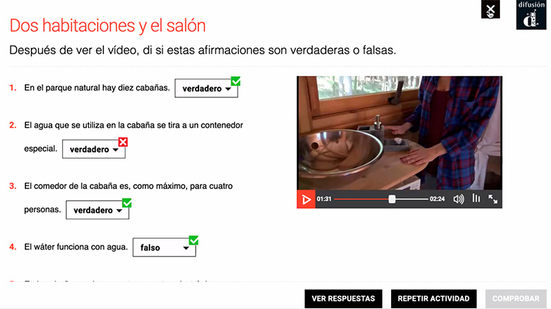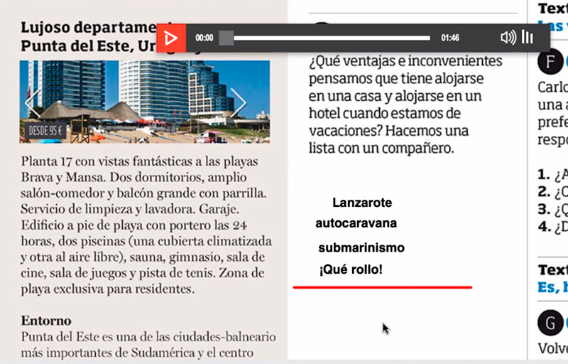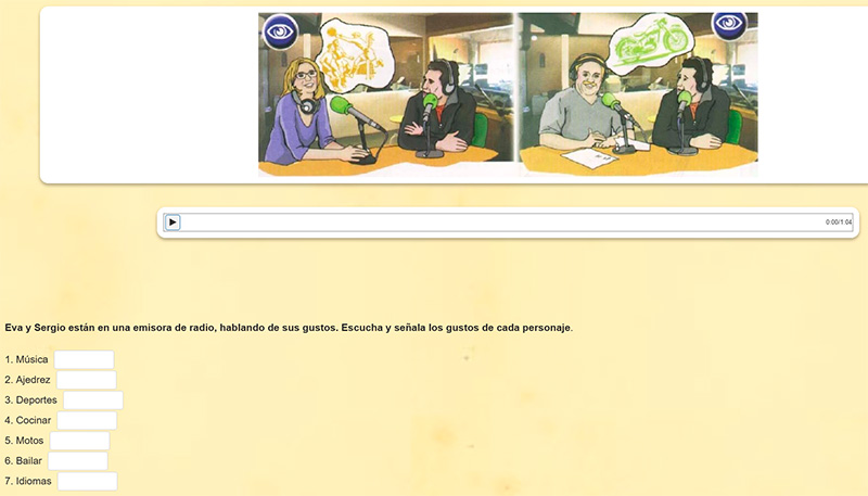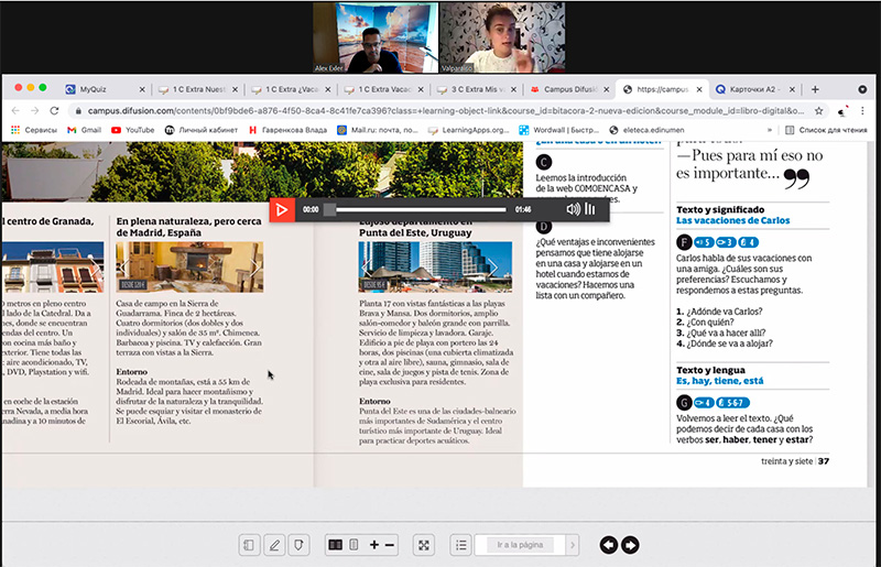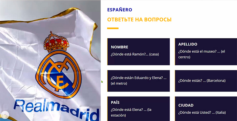 Использование разнообразных медиаматериалов приводит к тому, что урок проходит очень увлекательно, скучать при этом совершенно точно не приходится. И для освоения языка очень важно слышать разговоры носителей испанского, и именно они в заданиях и используются.
