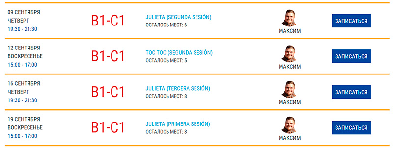 Преподаватель определяет ваш уровень, после чего вы выбираете из подходящих по уровню групп удобное вам расписание занятий. В индивидуальных занятиях очень удобно то, что количество еженедельных занятий и их время можно подобрать в соответствии с вашими собственными предпочтениями. В «Эспаньеро» рекомендуют два (стандарт) или три (интенсив) раза в неделю по 60 минут, но решаете как вам удобнее, конечно же, вы сами.
