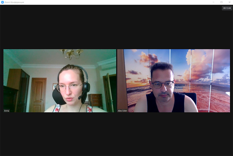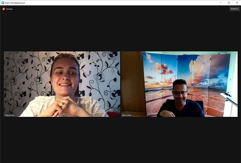 Групповое занятие происходит по похожей схеме, только при этом в конференции находится двое, трое или четверо учеников. (Ниже я показываю занятие для самой стартовой группы - A1-A2).