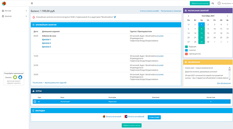 Согласованные дни и время занятий появятся в вашем личном кабинете на сайте "Эспаньеро". Там же, в личном кабинете, вы можете переписываться с вашим преподавателем, выполнять домашние задания, следить за оплатой и пополнять баланс счета.