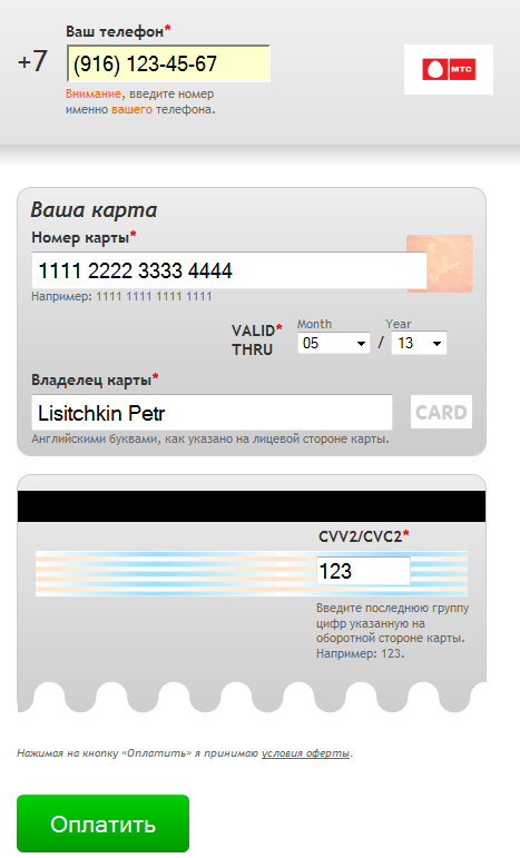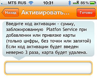 Там заполняется номер карты, срок действия и номер CVV (это дополнительные три цифры к номеру карты, которые пишутся на задней стороне - где магнитная полоса). После этого с указанной карты сервис снимает небольшую сумму (у меня сняли 4 рубля с копейками) и далее вам нужно указать это число (без точки или запятой, то есть если сняли 4,32 рубля, то указать "432") в пункте "Активировать карту".