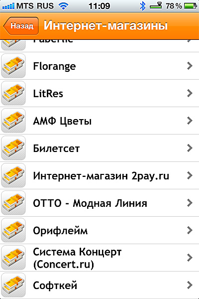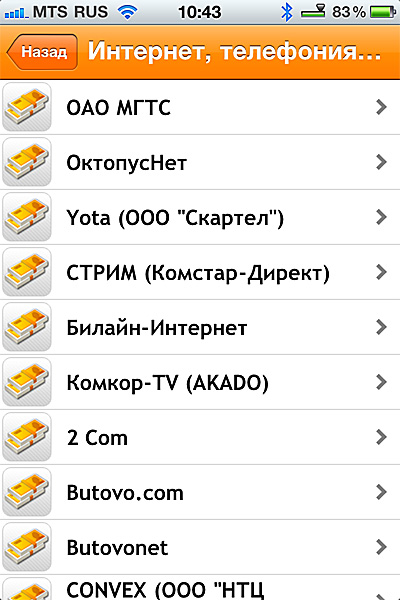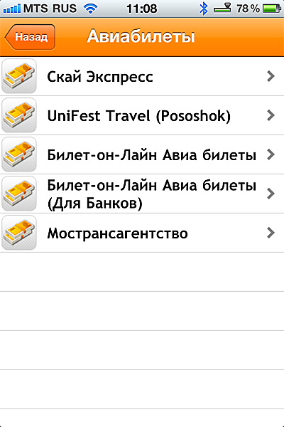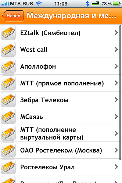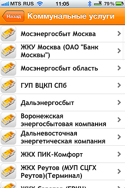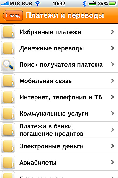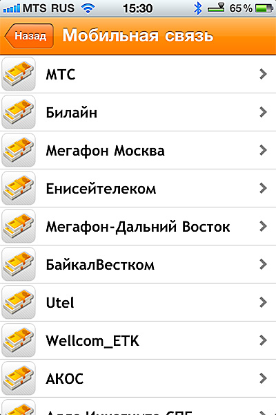 О переводах поговорим чуть позже, а сейчас - платежи. Как видно из картинки, платежи делятся по различным разделам - "Мобильная связь", "Коммунальные услуги" и так далее. Давайте пополним наш телефонный счет - заходим в "Мобильную связь". Там список всевозможных операторов.