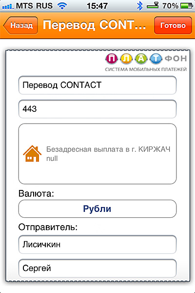 Далее выбираете вид платежа (кошелек ПЛАТфон, телефонный счет, банковская карта), совершаете перевод, после чего вам сообщают код перевода - его нужно сообщить получателю. После этого получатель в тот же день приходит в соответствующее отделение банка, называет код, показывает паспорт - и получает эти деньги.