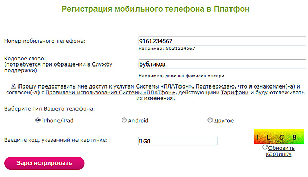Заходите на сайт "ПЛАТфона" и там регистрируете свой мобильный телефон, с которого будут осуществляться платежи. Для регистрации просто вводите номер телефона и выбранное кодовое слово.