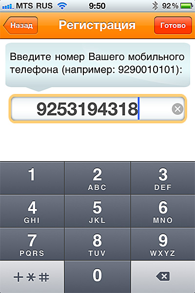 При нажатии на "Регистрация" приложение потребует ввести номер вашего мобильника, а потом указать одноразовый пароль, который указан в вашем личном кабинете на сайте.