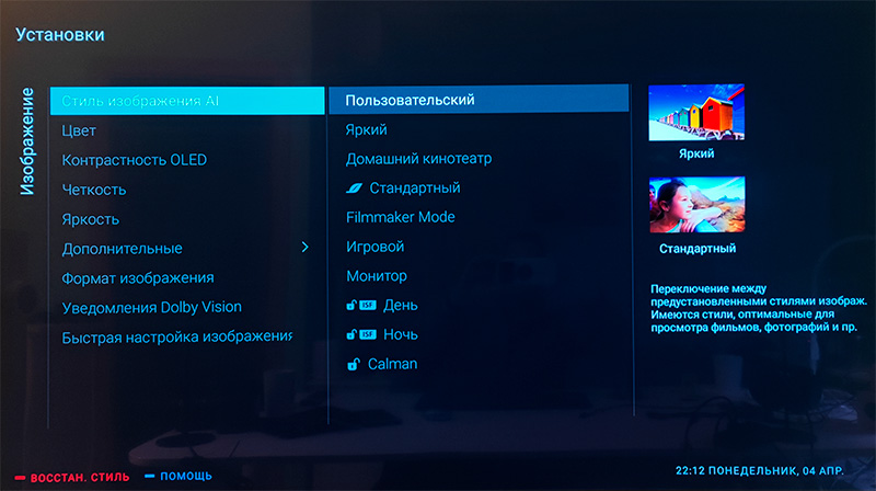 - соответствие видео (стандартный, естественный, спорт, яркий, игровой);