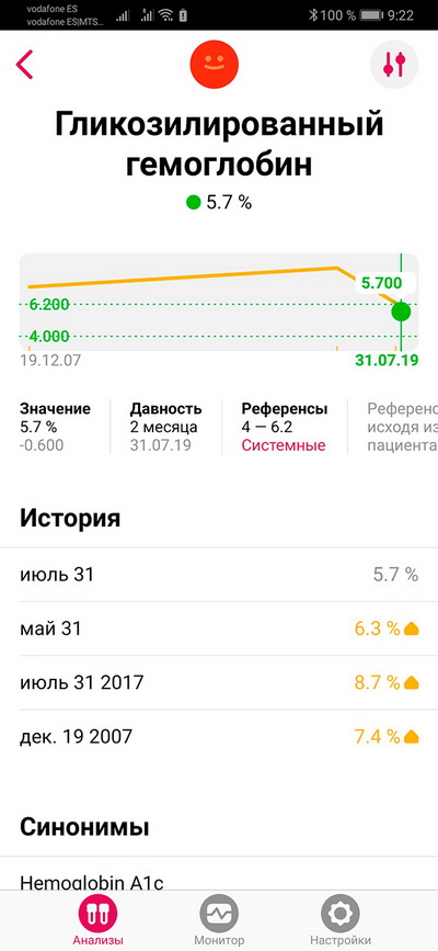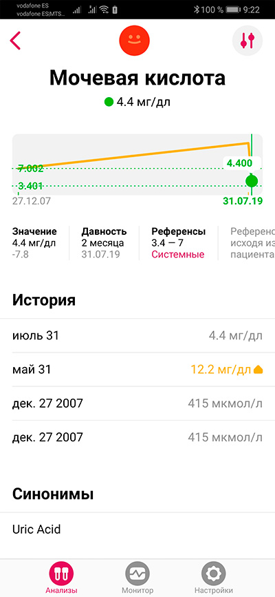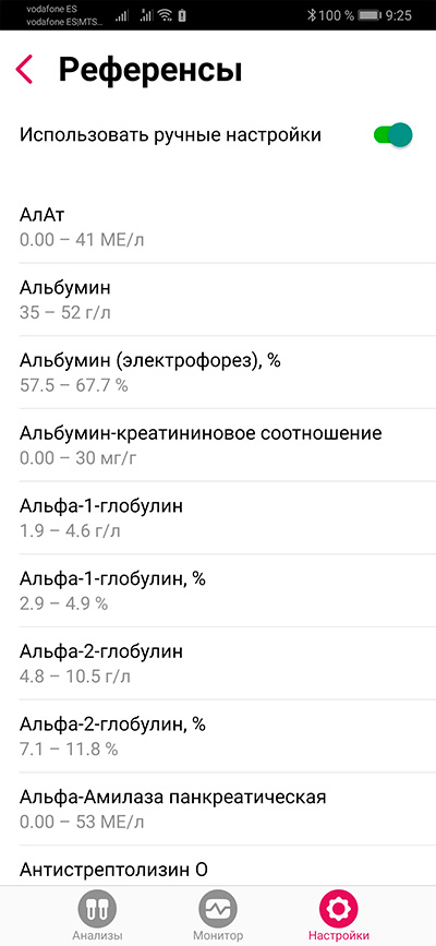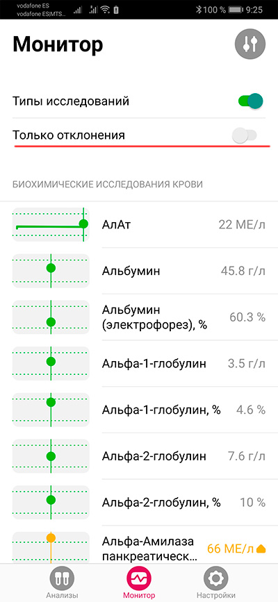 В мониторинге можно разбивать результаты на типы исследования (биохимия крови, гормональные исследования и так далее), также можно отдельно выводить отклонения - это тоже очень и очень удобно.