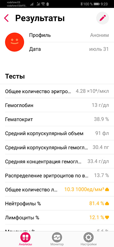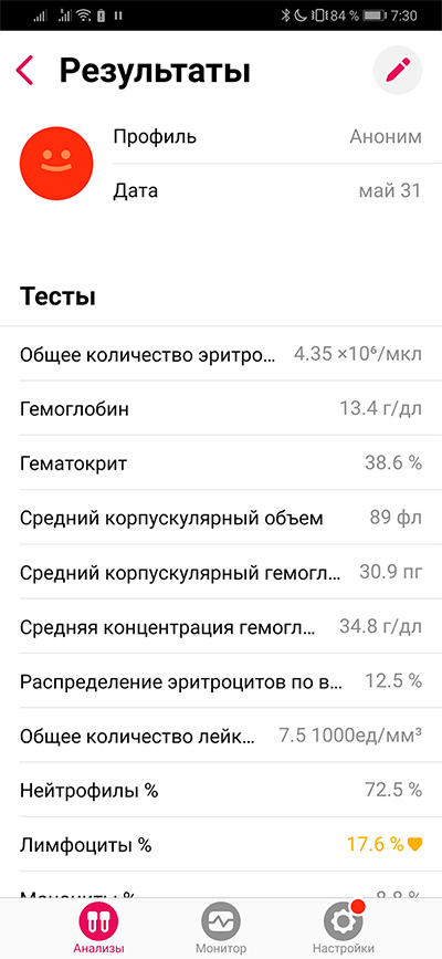 Захожу в общий анализ крови, сверяю с документом. Слушайте, все точно, цифра в цифру! И результаты выводятся в удобном виде: значения, выходящие за референсные, подсвечиваются.