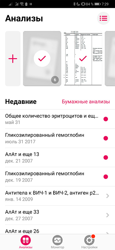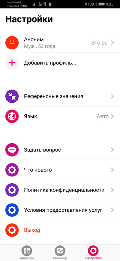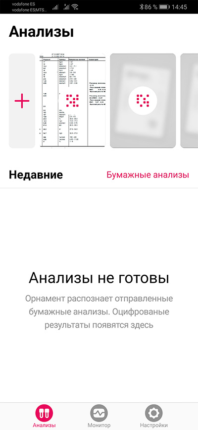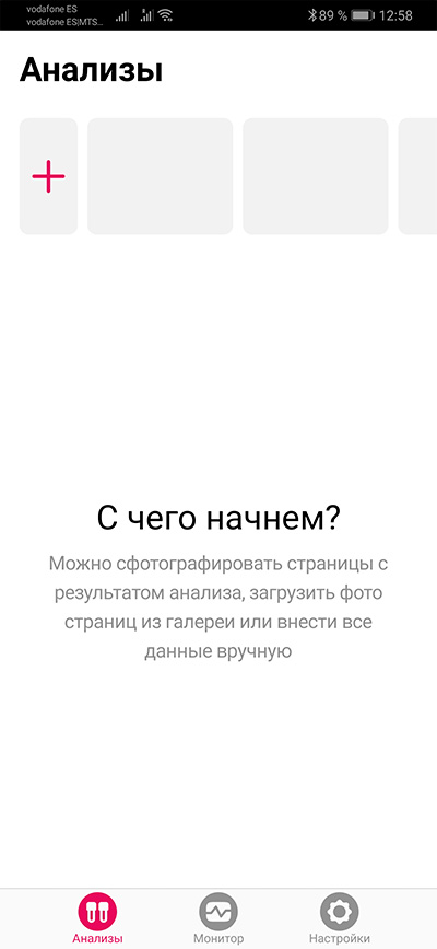 Интерфейс у программы очень простой: снизу идут закладки "Анализы", "Монитор", "Настройки". В "Анализах" крупный плюсик - для добавления данных.