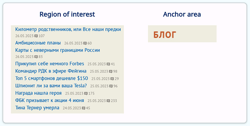 А якорная область - это что-то не меняющееся, что помогает сервису найти область интересов на странице, где бы она не находилась. И в данном случае это будет заголовок "БЛОГ". И теперь, даже если заголовок вдруг переедет в другую область, сервис его найдет - именно в этом смысл!