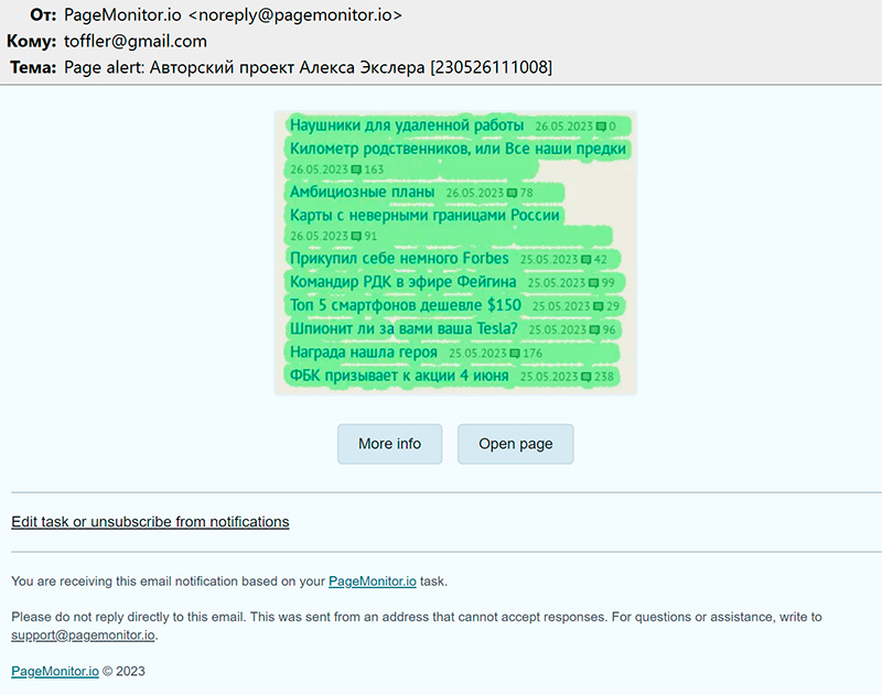Ну и замечу, конечно, что так как сервис автоматически опрашивает те сайты, за изменениями на которых вы хотите следить, он не сможет присылать вам уведомления об изменениях, если на сайтах стоит защита от роботов - например, капча. Но тут уж ничего не поделать.