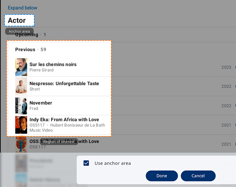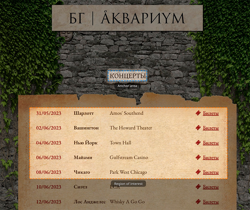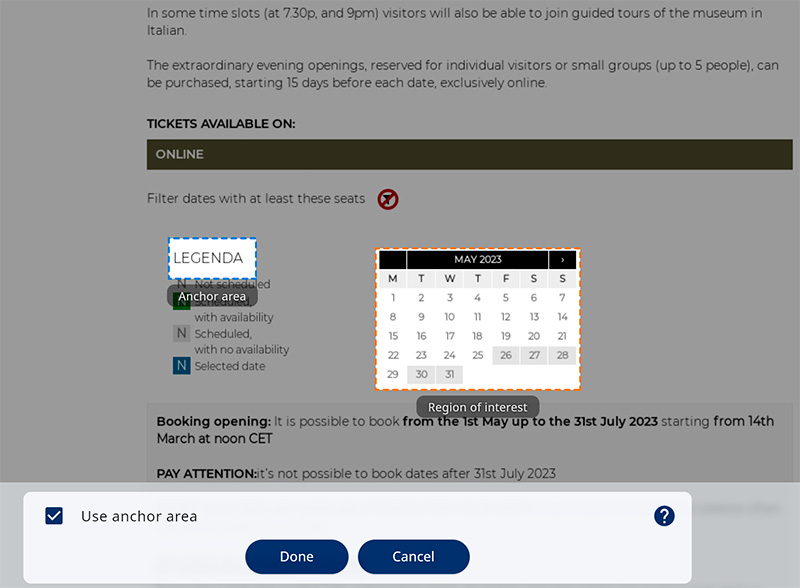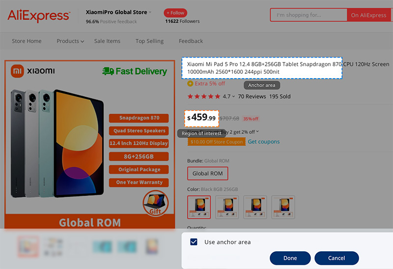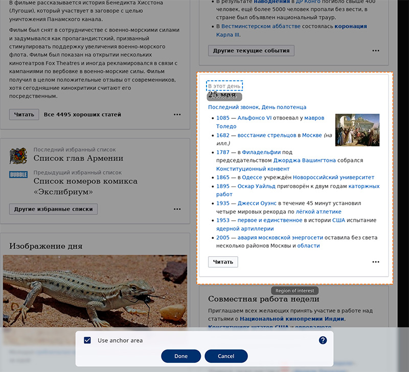 После этого сервис делает скриншоты этой страницы и предлагает вам выбрать вам якорную область (anchor area) - она подсвечена синим, - и область интересов (region of interest), которая подсвечена оранжевым цветом.