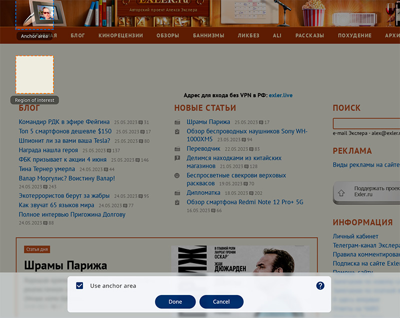 Выбираем область интересов (зону анонсов блога), устанавливаем якорную область (заголовок "БЛОГ") нажимаем кнопку Done.