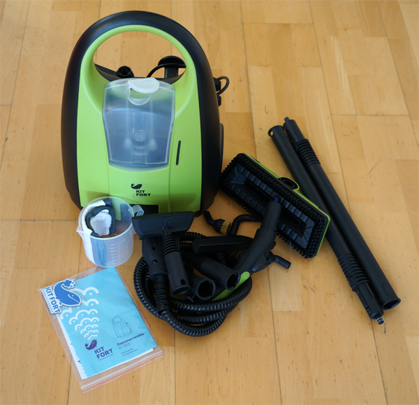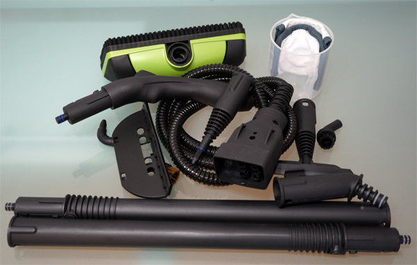 Комплектация: пароочиститель со шнуром, паровым шлангом и рукояткой, щетка для пола, переходник к щетке для пола, тряпка для пола, удлинительная трубка, струйная насадка, щетка для отпаривания, тряпка для отпаривания, скребок для стекла, круглая нейлоновая щетка, круглая латунная щетка, угловая насадка, мерная чашка, руководство пользователя.