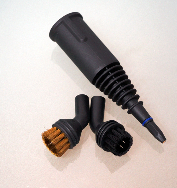 Струйная насадка, которая может использоваться для очистки всяких труднодоступных мест. На нее, в свою очередь, могут насаживаться круглая нейлоновая щетка (сантехника, плинтусы, кухня) и круглая латунная щетка (особо загрязненные места, духовка, плиты и так далее).