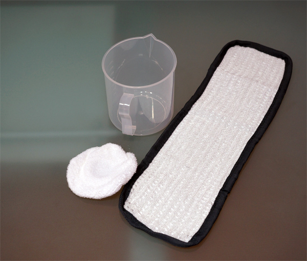 Тряпка для половой щетки, тряпка для отпаривателя, мерный стакан.
