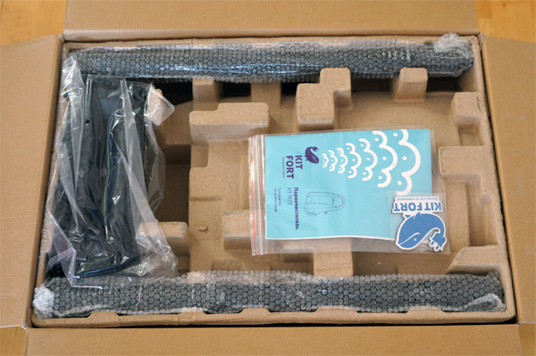 Ласково дебоксируем: в чреве кита находится аккуратная двухэтажная упаковка - сверху аксессуары, снизу корпус пароочистителя.