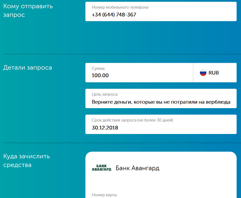 Новая интересная возможность - "Запрос перевода". Вы можете запросить перевод у кого-то по его номеру телефона. Указываете номер, цель запроса, срок действия запроса и карту, на которую нужно зачислить средства.