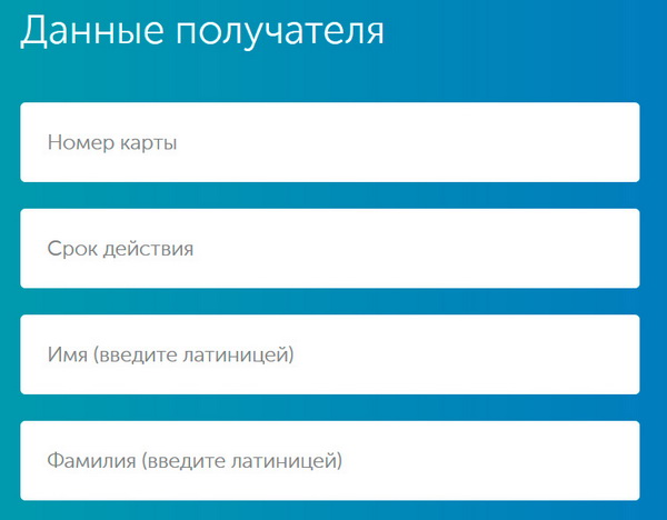 Для перевода на карту получателя нужно заполнить номер карты, срок действия, имя и фамилию латиницей - это для перевода за рубеж. С российской на российскую карту достаточно только номера.