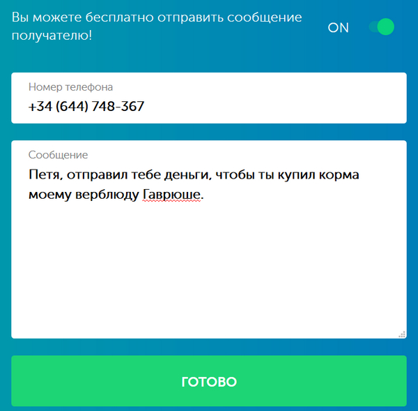 Чтобы осуществить перевод, нужно ввести соответствующую сумму, страну списания и получения, а для некоторых стран можно выбрать и валюту зачисления, после чего нажать кнопку "Перевести деньги".