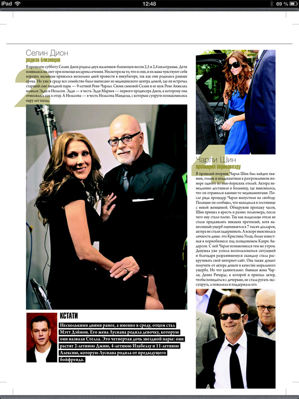 Да, конечно, традиционные ежемесячные издания, сверстанные под формат, условно говоря, А4 (тот же, например, журнал Maxim), на экране планшета выглядели мелковато, и его статьи приходилось масштабировать для чтения, что не слишком удобно. А вот издания меньшего формата (тот же "МК-бульвар") уже и в полном формате читались без проблем. Я находил их в PDF, загружал в iBooks - так и читал. (Далее все уменьшенные скриншоты в статье - кликабельны.)