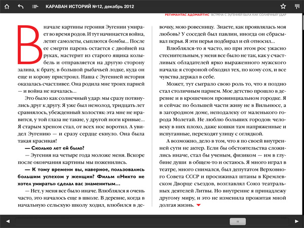 Также во многих изданиях делается очень удобная навигация, когда вы горизонтально перемещаетесь по содержимому (статьям), а вертикально - скроллируется читаемая статья. Вот, например, статья из "Каравана историй".