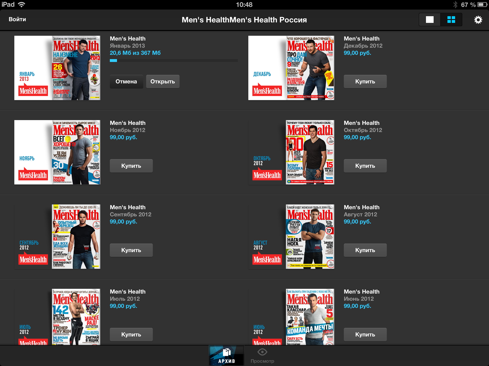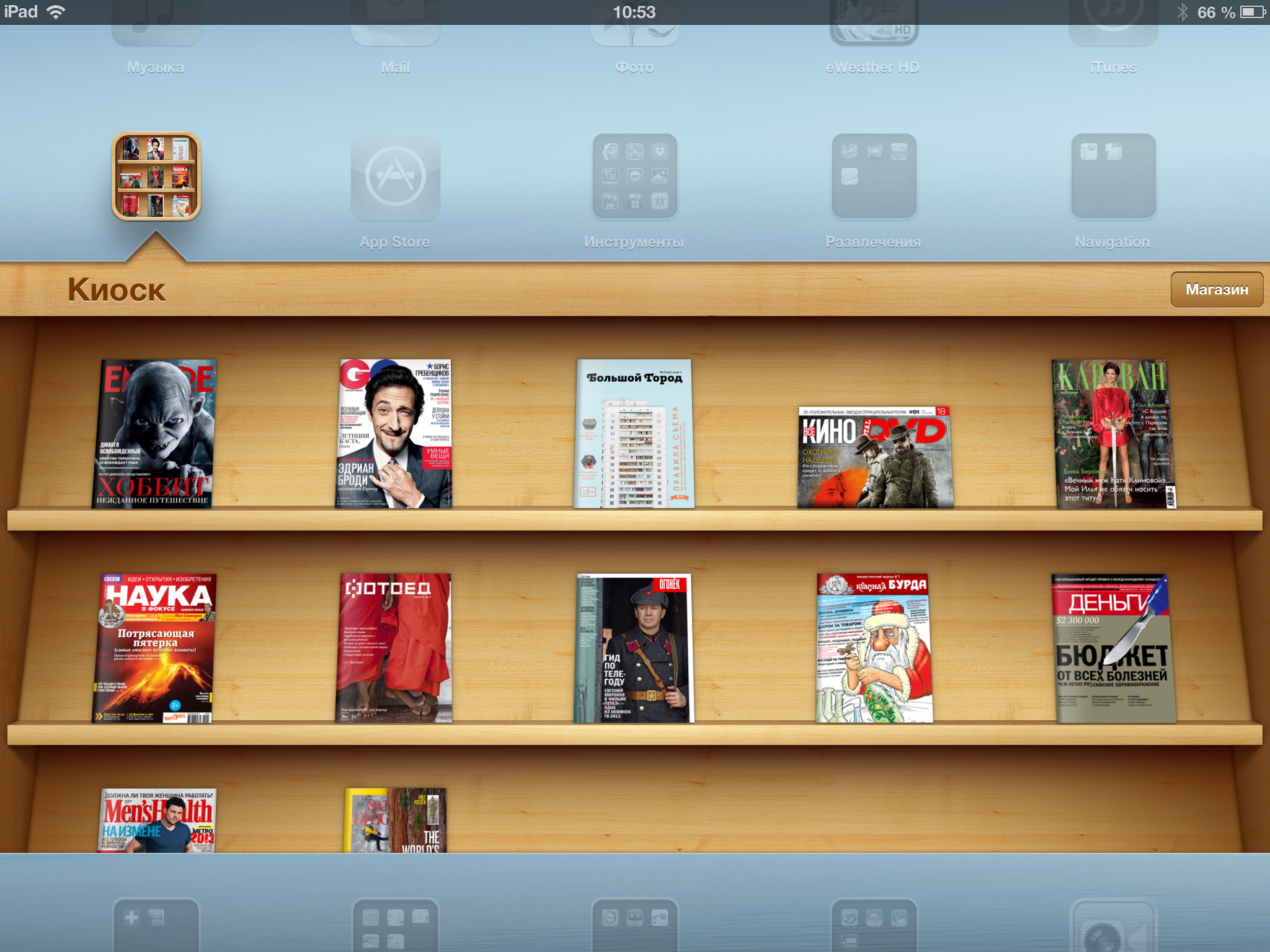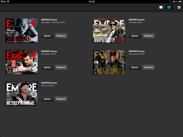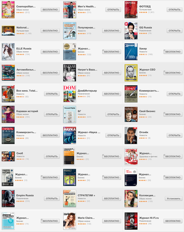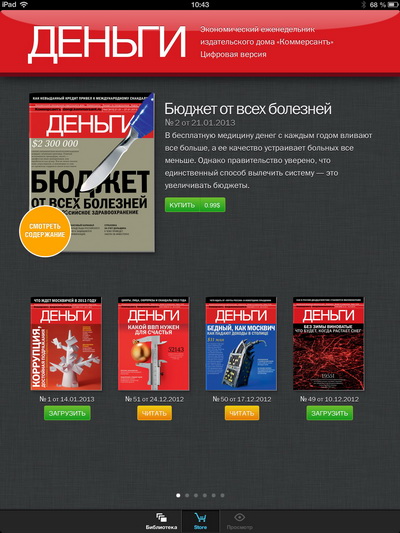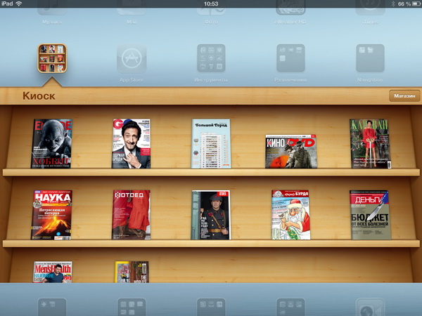 Это было очень правильное решение, потому что, несмотря на то что в iBooks теоретически можно было загружать периодику в PDF, понятно, что для периодических изданий должен быть какой-то свой собственный формат, использующий интерактив и мультимедиа. "Киоск" именно это и предлагал: доступ в магазин периодических изданий, где можно скачать бесплатные журналы, купить отдельные платные экземпляры или оформить подписку на периодику. Плюс в том же "Киоске" это все и читалось, причем очень даже удобно.