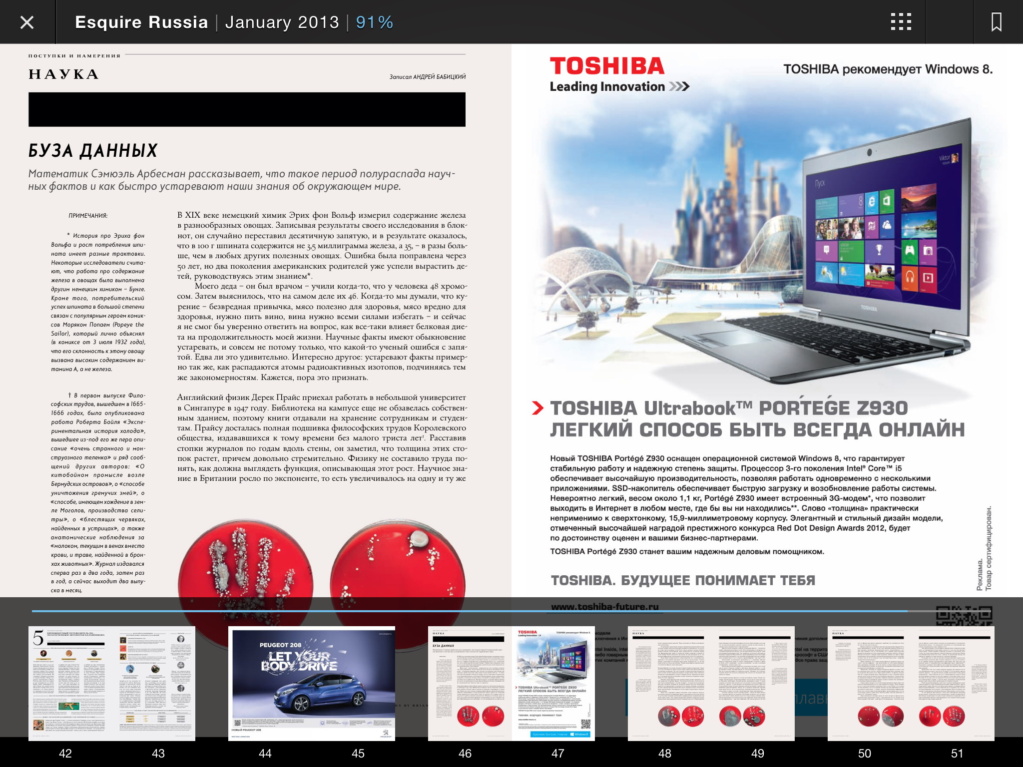Вот так в Zinio выглядит журнал Esquire в альбомном режиме со строкой навигации по страницам.