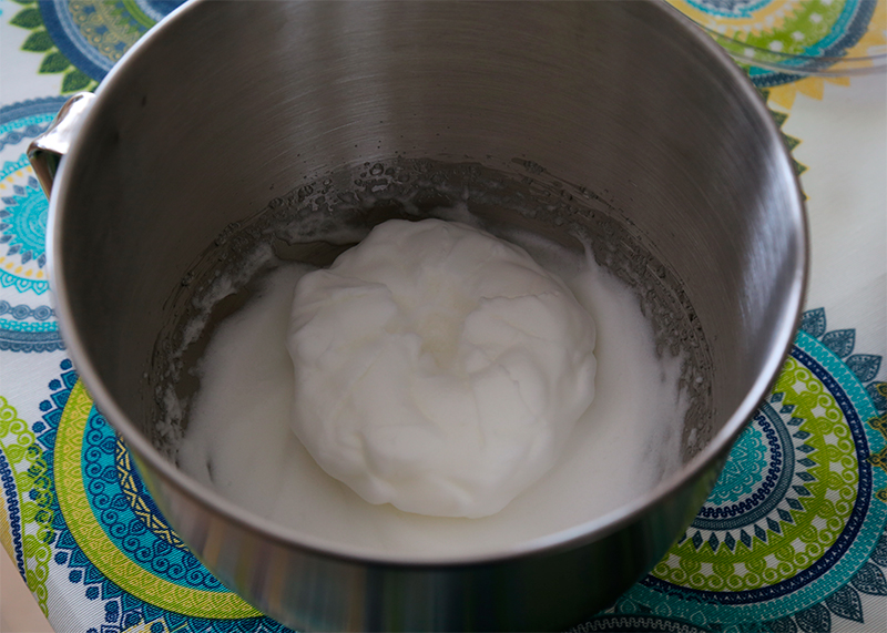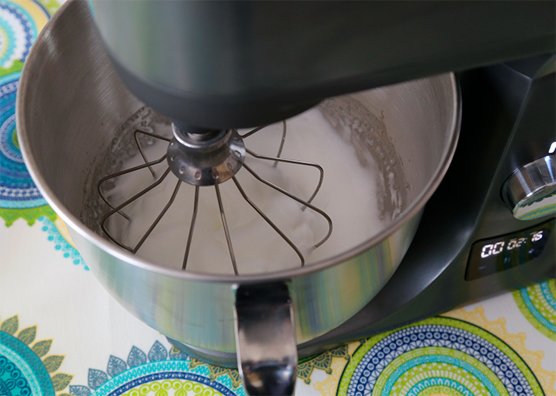 Я взял белки от двух яиц. Насадка-венчик, сначала пара минут на четвертой скорости, затем на полную мощность.