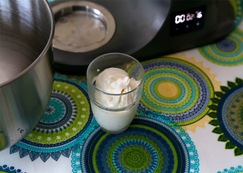 Добавляем сахар (заменитель) по вкусу, насадка-венчик, ставим на полную скорость. Здесь нужно внимательно следить за консистенцией и, когда сливки достигнут нужной кондиции, немедленно выключать миксер, иначе сливки собьются в масло.