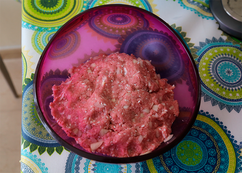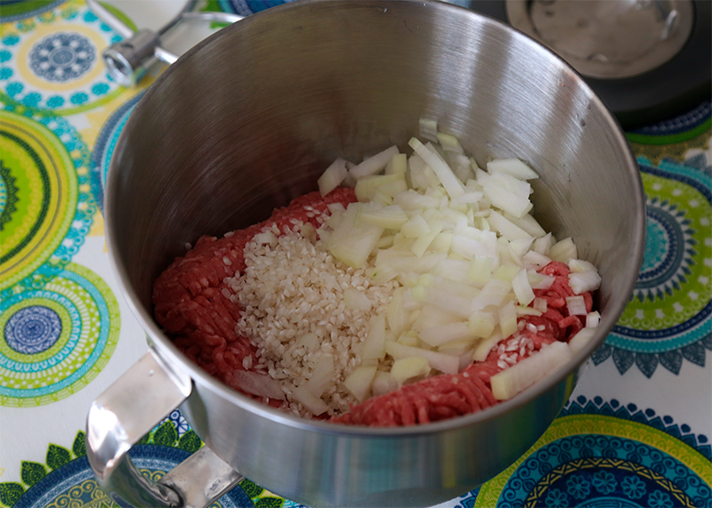 В фарш для ежиков (фаршированных перцев) добавляются рис и резаный лук. Все это, конечно, можно руками перемешать, но мне интересно было, как с этим справится миксер.